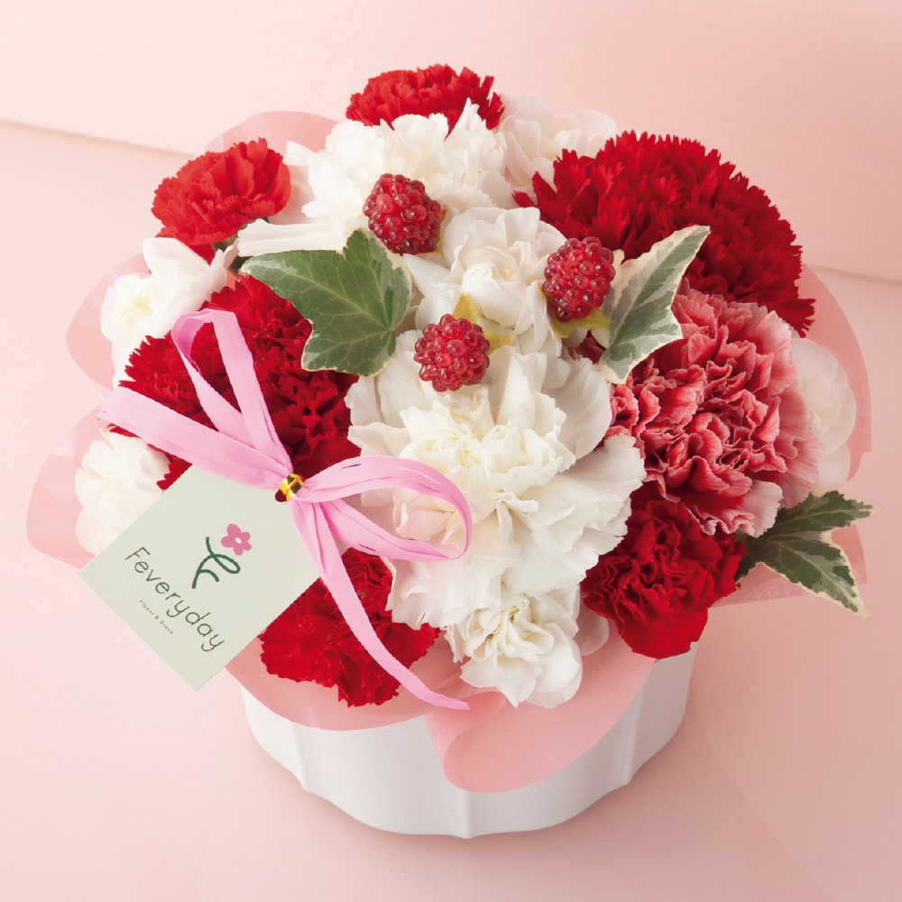 ホイップクリームに見立てた白に、赤いカーネーションとラズベリーが映える、かわいいフラワーアレンジメントです。
