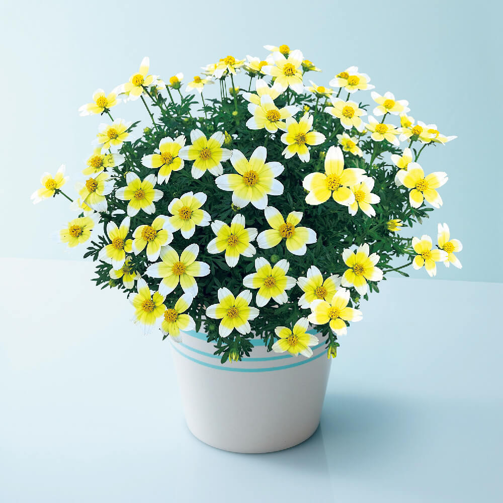 透明感のあるレモンイエローとホワイトの花びらがかわいらしい一鉢です。