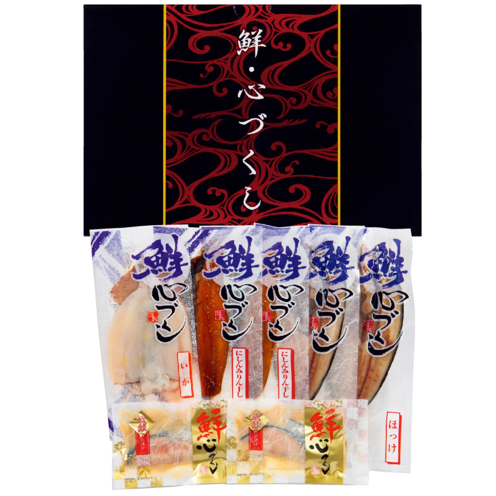 真ほっけ開き150g×2、秋鮭西京漬け70g×2、にしん味醂干し60g×2、開きいか70g