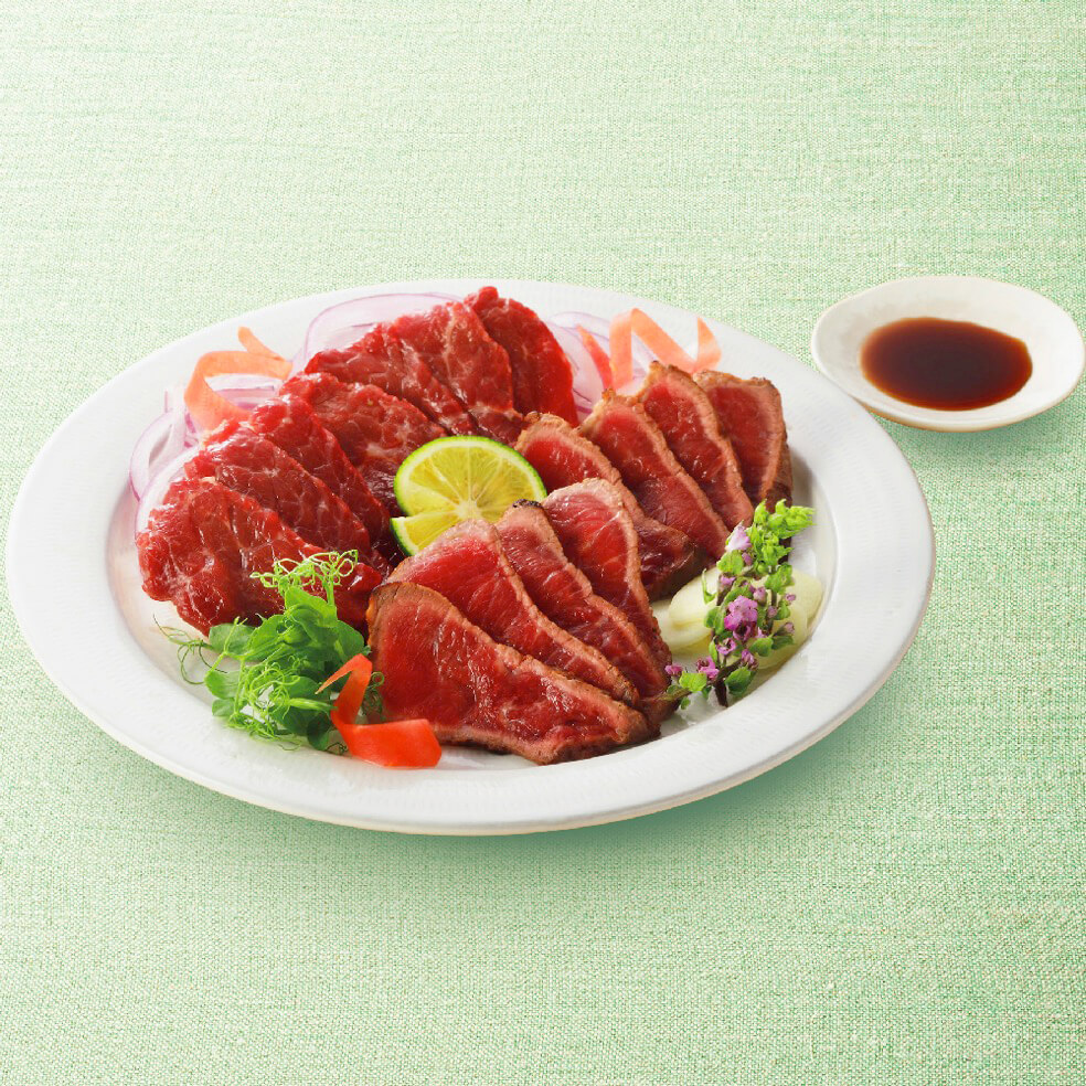 あっさりとした馬刺しの赤身と、赤身のたたきをセットに。たたきは特製おろしぽん酢でお召し上がりください。