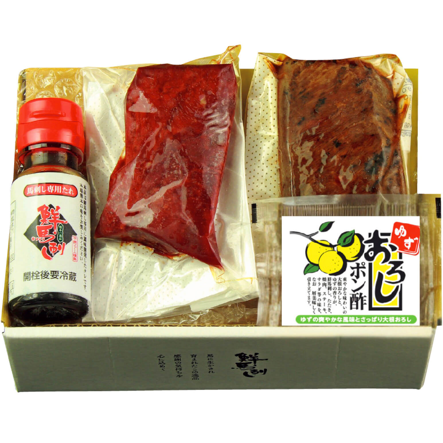 馬刺し(赤身80g、たたき80g)(各原料:肉/カナダ又はフランス産)、たれ50ml、ぽん酢20g