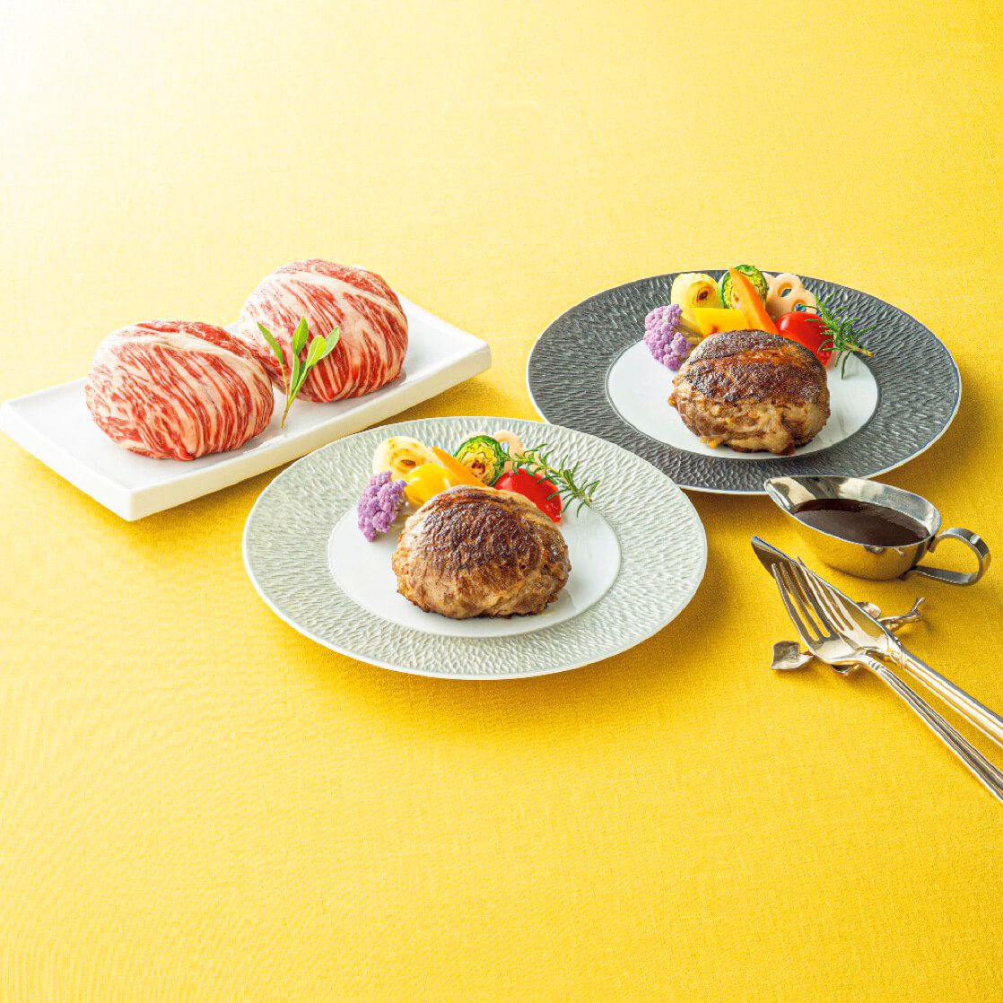 吟味した北海道産素材でつくったハンバーグを、北海道産霜降り牛かたロースで一つひとつ丁寧に包み込みました。