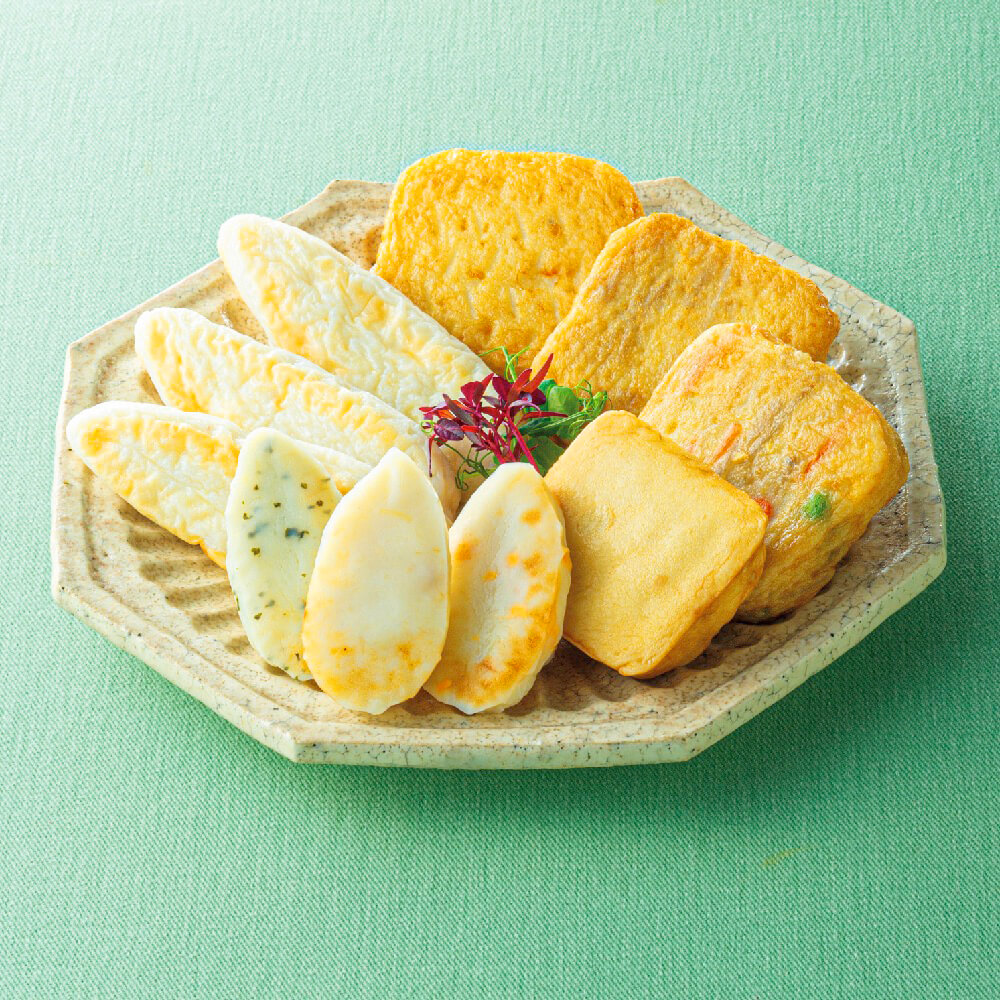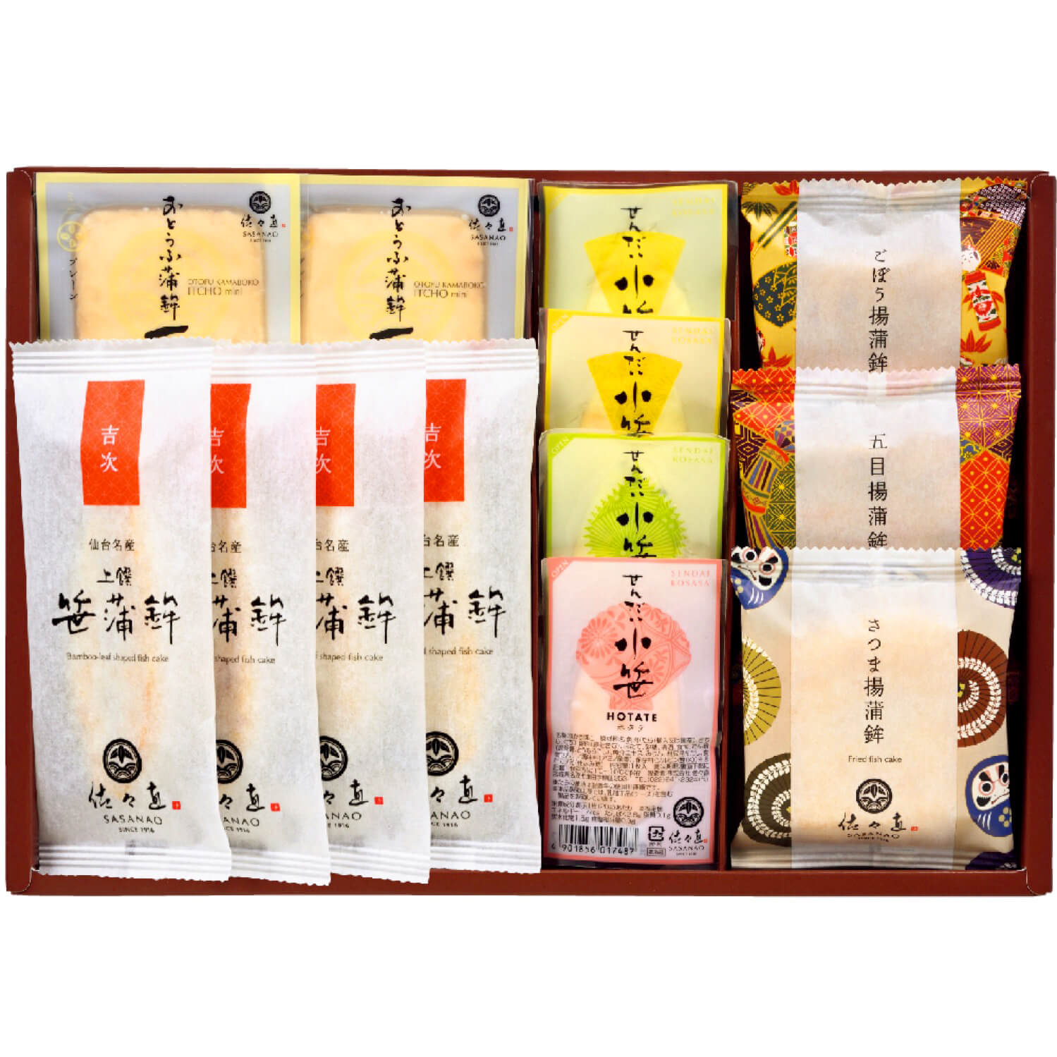 たらや吉次などを原料にした笹かまぼこと、揚蒲鉾、おとうふ蒲鉾を多彩に詰合せました。
