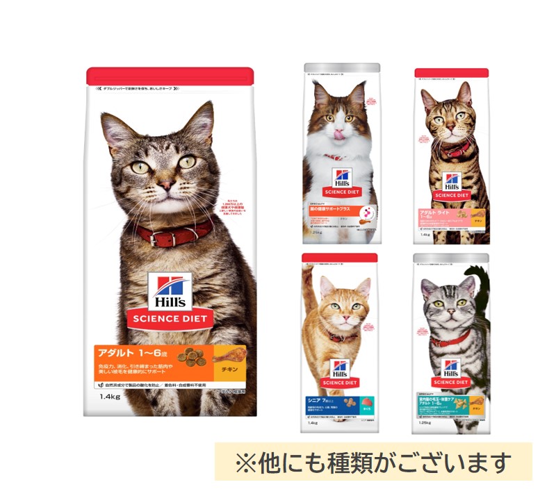 トウモロコシ、トリ肉(チキン、ターキー)、コーングルテン、動物性油脂、魚油、ポークエキス、小麦、米、アミノ酸類(タウリン、トリプトファン、メチオニン、リジン)、ミネラル類(カルシウム、ナトリウム、カリウム、クロライド、銅、鉄、マンガン、セレン、亜鉛、ヨウ素)、乳酸、ビタミン類(A、B1、B2、B6、B12、C、D3、E、ベータカロテン、ナイアシン、パントテン酸、葉酸、ビオチン、コリン)、L-カルニチン、酸化防止剤(ミックストコフェロール、ローズマリー抽出物、緑茶抽出物)