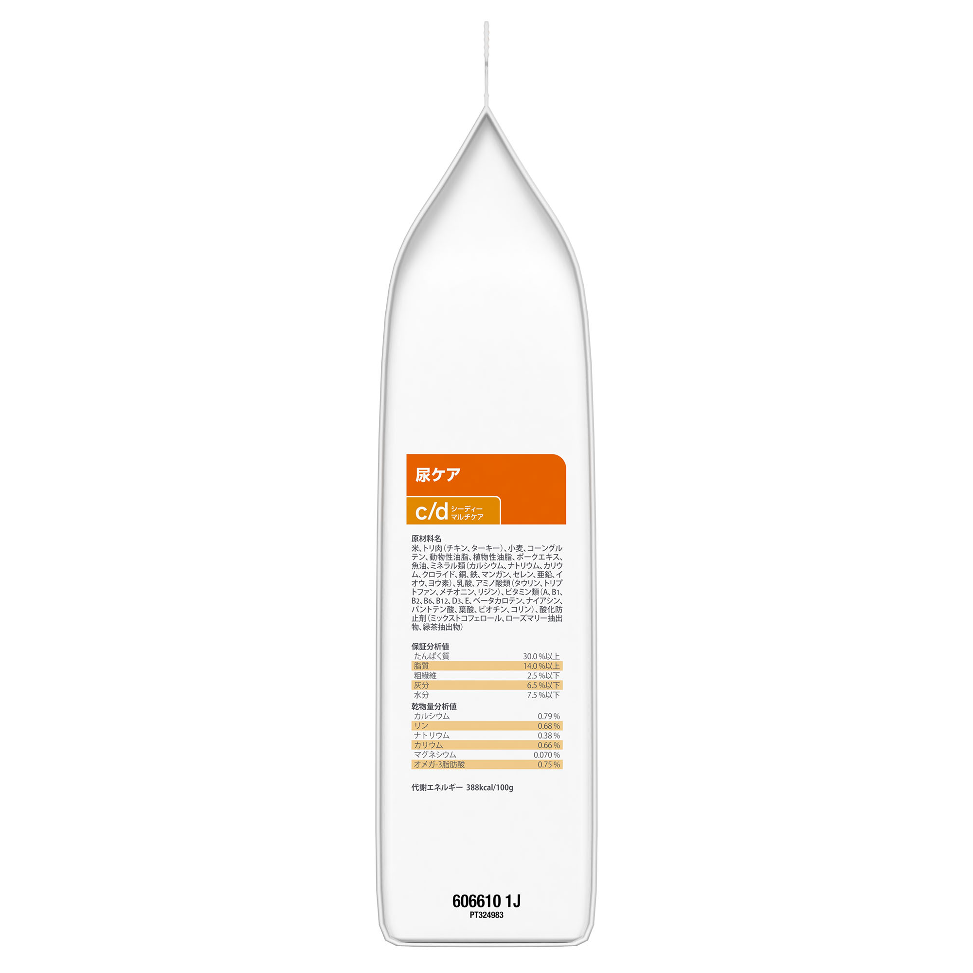 米、トリ肉(チキン、ターキー)、小麦、コーングルテン、動物性油脂、植物性油脂、ポークエキス、魚油、ミネラル類(カルシウム、ナトリウム、カリウム、クロライド、銅、鉄、マンガン、セレン、亜鉛、イオウ、ヨウ素)、乳酸、アミノ酸類(タウリン、トリプトファン、メチオニン、リジン)、ビタミン類(A、B1、B2、B6、B12、D3、E、ベータカロテン、ナイアシン、パントテン酸、葉酸、ビオチン、コリン)、酸化防止剤(ミックストコフェロール、ローズマリー抽出物、緑茶抽出物)