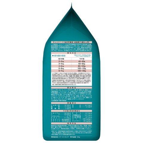 チキン、チキンミール、コーングルテン、小麦、米、脱脂大豆、鶏脂(オメガ6脂肪酸源)、フィッシュミール、小麦たんぱく、たんぱく加水分解物、可溶性繊維(プレバイオティクス源)、魚油(オメガ3脂肪酸(DHA)源)、酵母(βグルカン源)、ミネラル類(カルシウム、リン、カリウム、ナトリウム、クロライド、マグネシウム、鉄、銅、マンガン、亜鉛、ヨウ素、セレン)、ビタミン類(A、D、E、K、B1、B2、パントテン酸、ナイアシン、B6、葉酸、ビオチン、B12、コリン、C)、アミノ酸類(メチオニン、タウリン)