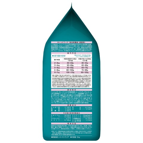 フィッシュ(サーモン、ツナ)(オメガ3脂肪酸源)、コーングルテン、 チキンミール、小麦、 食物繊維(ビートパルプ、ライスファイバー、可溶性繊維、セルロース)、米、 小麦たんぱく、 脱脂大豆、大麦、 鶏脂(オメガ6脂肪酸源)、たんぱく加水分解物、フィッシュミール、酵母(βグルカン源)、ミネラル類(カルシウム、リン、カリウム、ナトリウム、クロライド、マグネシウム、鉄、銅、マンガン、亜鉛、ヨウ素、セレン)、カラメル色素、ビタミン類(A、D、E、K、B1、B2、パントテン酸、ナイアシン、B6、葉酸、ビオチン、B12、コリン、C)、アミノ酸類(メチオニン、タウリン)