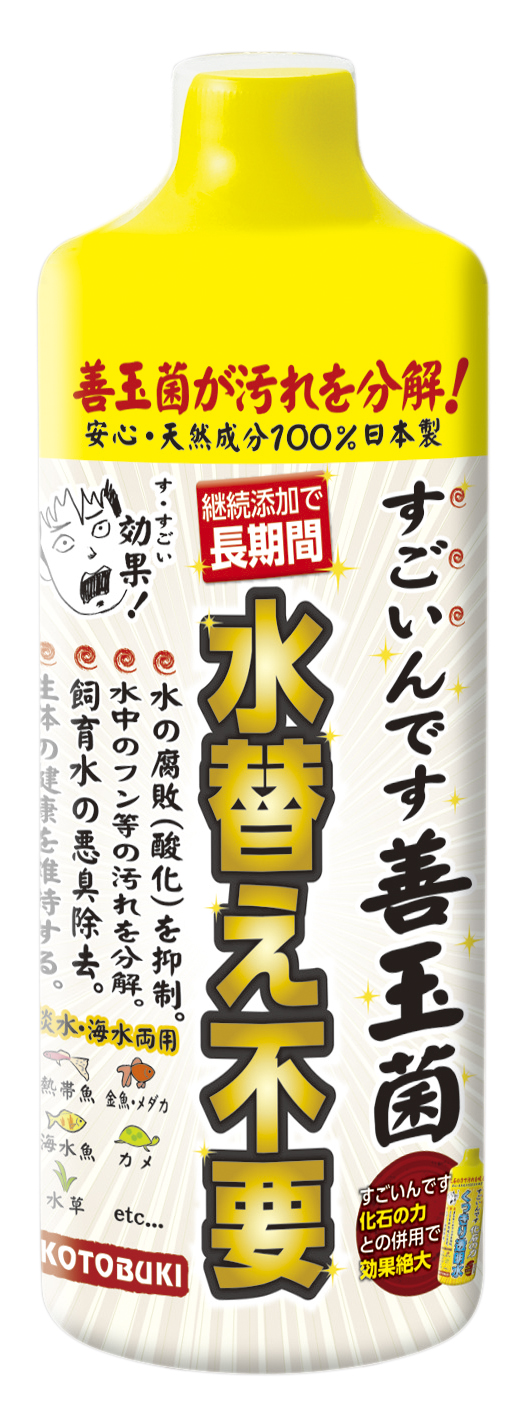 ●特殊な方法で培養した乳酸菌をはじめ酵母菌や光合成細菌、放線菌、糸状菌などが生産する複合酵素の力で有害な悪玉菌を撃退し善玉菌を増殖させます。水の良い状態が維持することから、生体の健康を維持させ、水換えの回数が減り、飼育が楽になります。