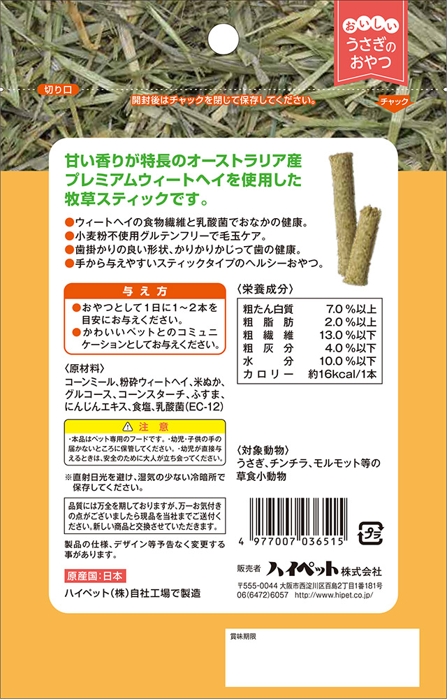 ●ウィートヘイの食物繊維と乳酸菌でおなかの健康を守ります。歯掛かりの良い形状で、かりかりかじって歯の健康維持。手から与えやすいスティックタイプのヘルシーおやつです。false