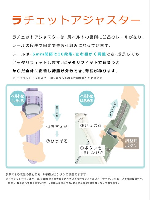 ■ラチェットアジャスター 肩ベルトの長さをお子様でも簡単に調整できます。6年間、毎日ジャストサイズで背負って、肩や腰への負担を軽減できます。
