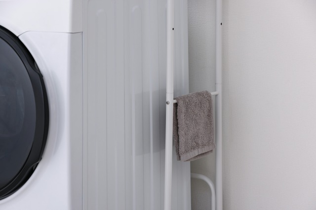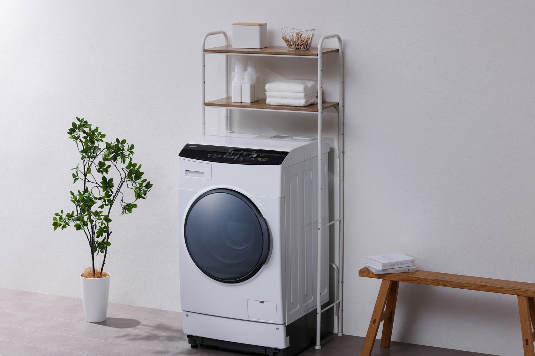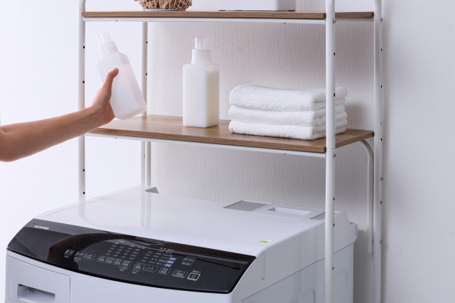インテリアに馴染む木目調の棚板はランドリー周りをおしゃれに収納できます。