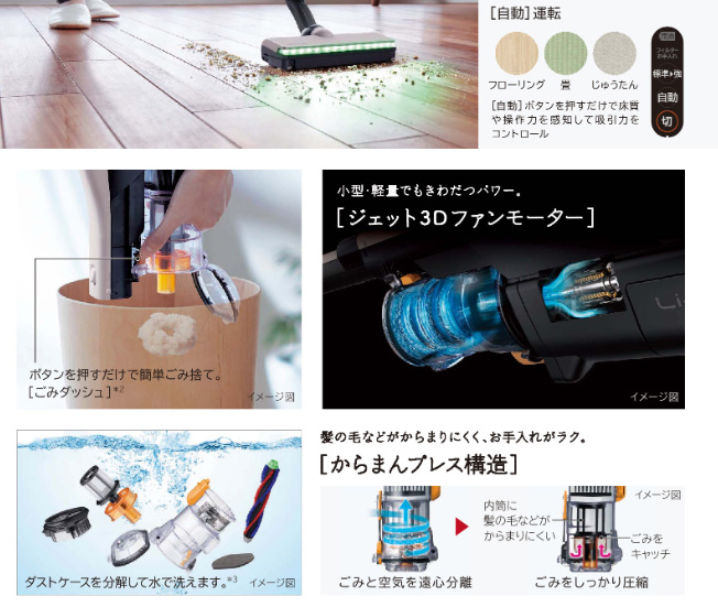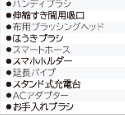 自走機能、クルッとヘッド、ペタリンコ構造、からまん機構、回転ブラシ、ワンタッチ着脱、水洗い対応、モーター駆動方式、からまんブラシ、2アングル形状
