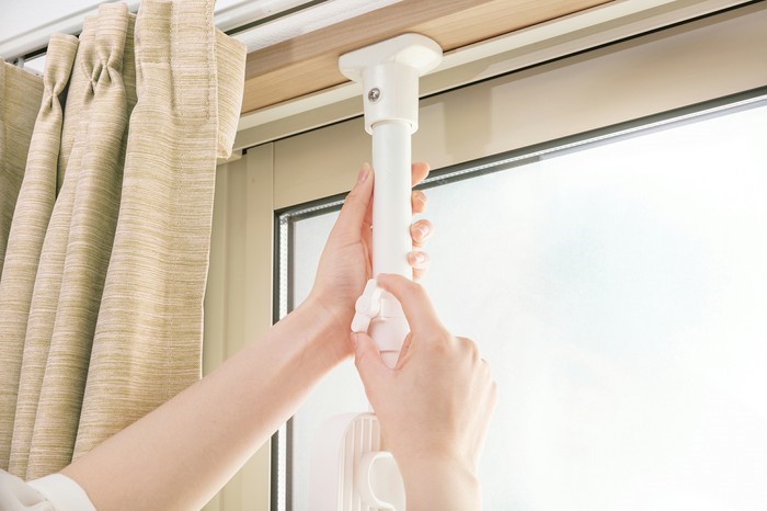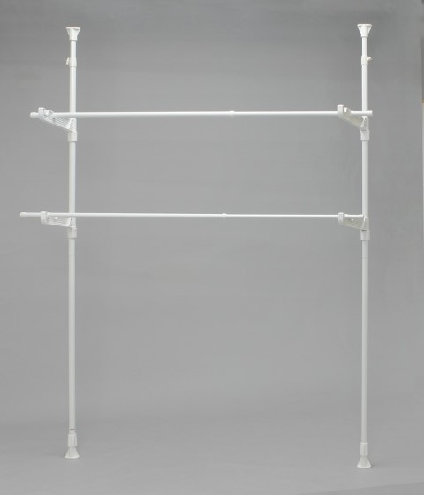 伸縮棒を窓枠に取り付けるだけで簡単に組み立てられ、竿受け部は窓のサイズや洗濯物を干す位置に応じて高さを自由に変えられます。