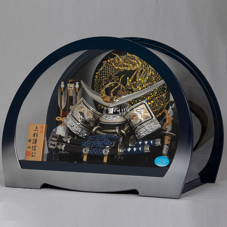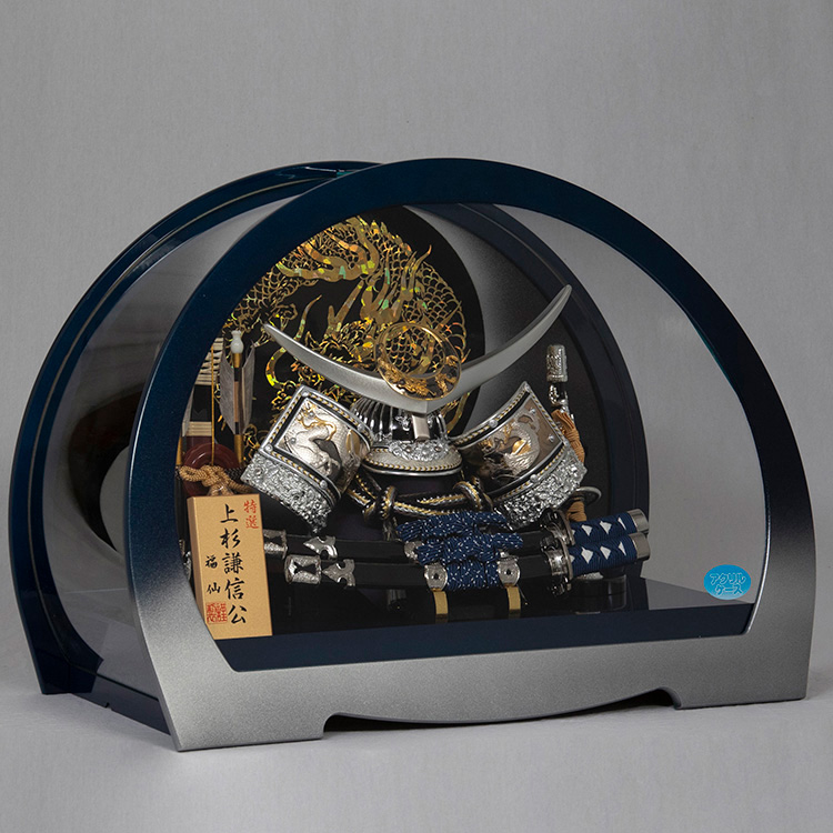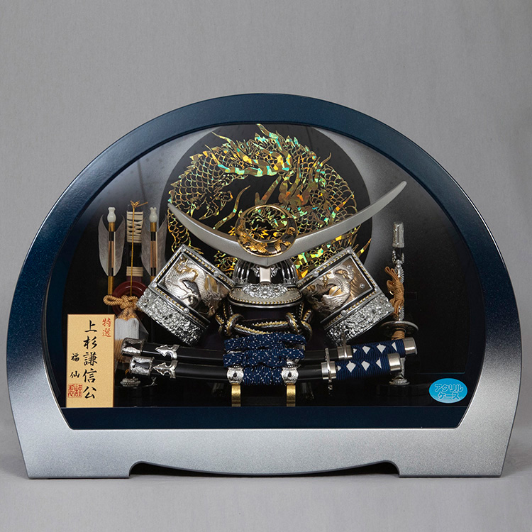 背景には躍動する円龍を配した上杉謙信公の兜飾りです。