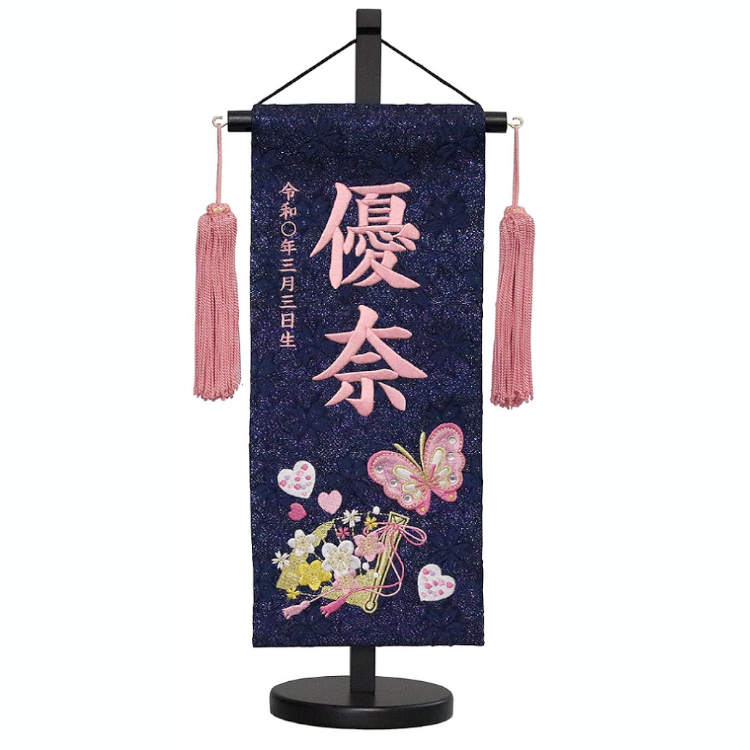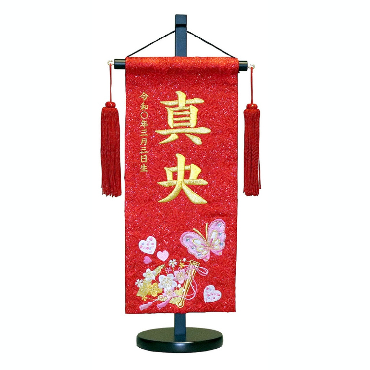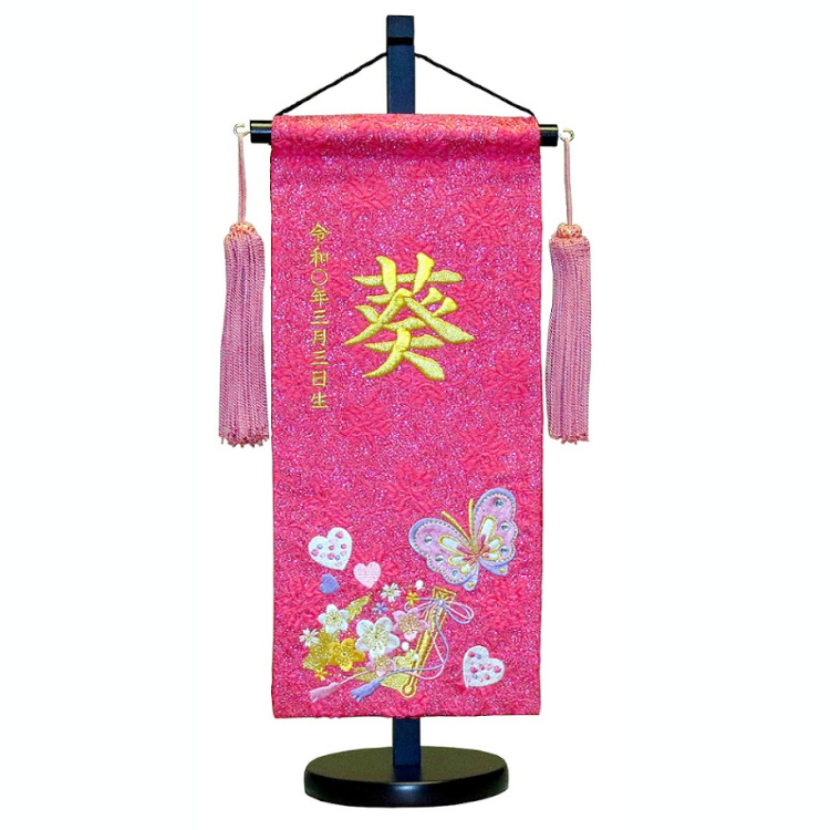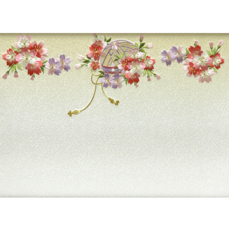 毬と桜の刺繍を施した華やかな背景です。幕板にも桜柄の刺繍を施しました。