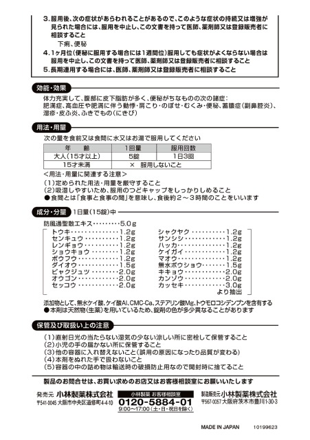 防風通聖散エキス (トウキ:1.2g、センキュウ:1.2g、レンギョウ:1.2g、ショウキョウ:1.2g、ボウフウ:1.2g、ダイオウ:1.5g、ビャクジュツ:2.0g、オウゴン:2.0g、セッコウ:2.0g、シャクヤク:1.2g、サンシシ:1.2g、ハッカ:1.2g、ケイガイ:1.2g、マオウ:1.2g、無水ボウショウ:1.5g、キキョウ:2.0g、カンゾウ:2.0g、カッセキ:3.0gより抽出):5.0g