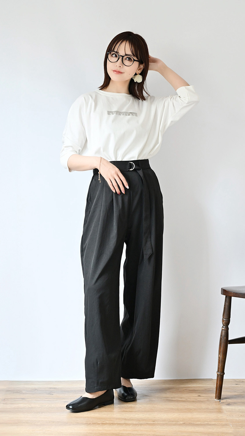 共布のベルトがセットになっているので、トップスをインした着こなしもすっきり決まります。