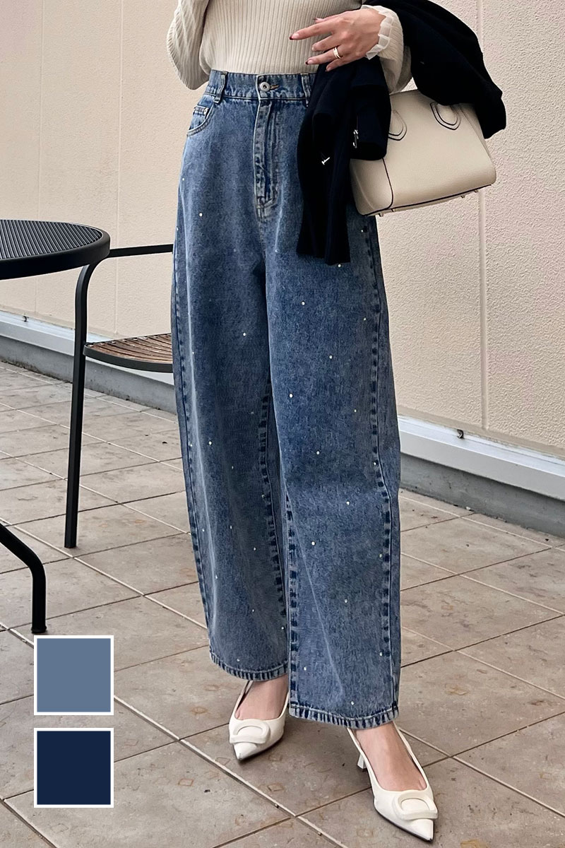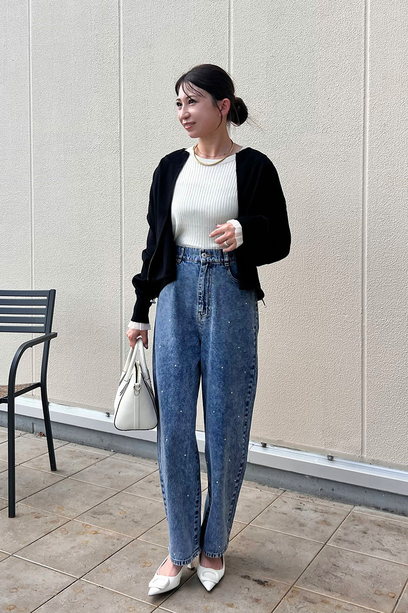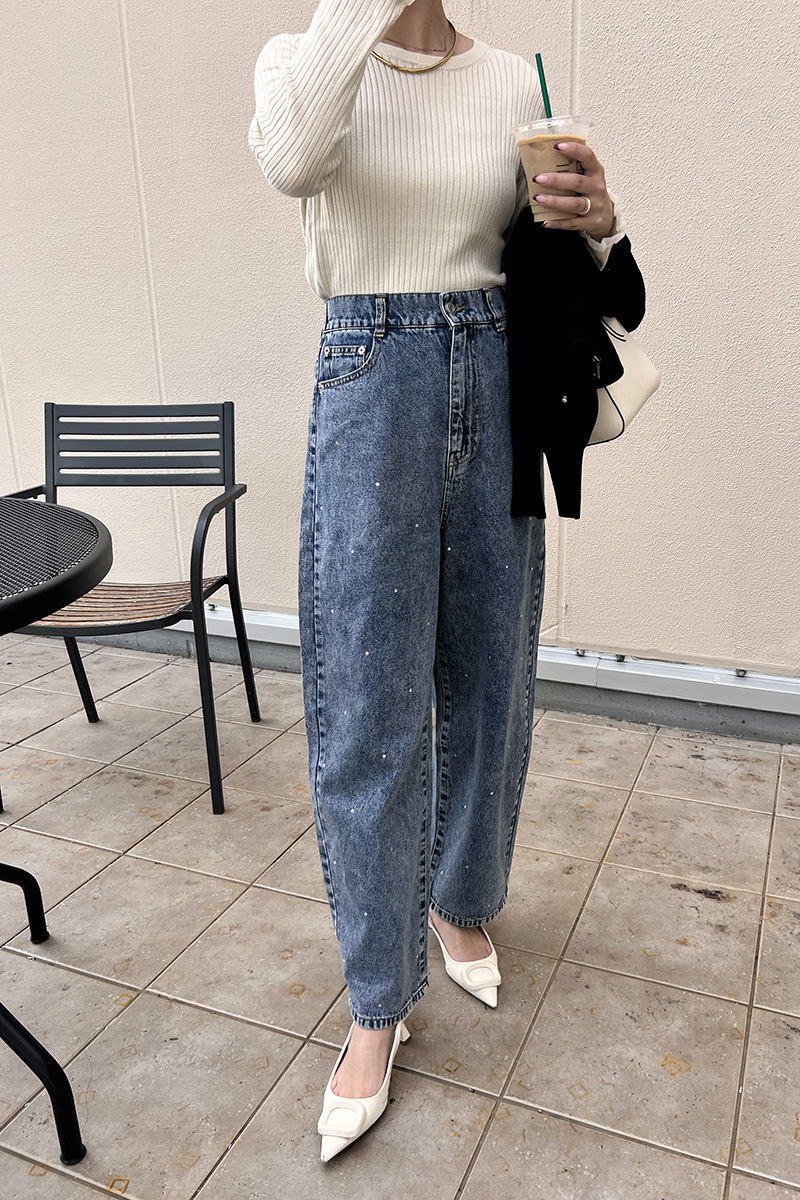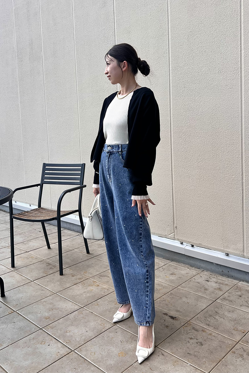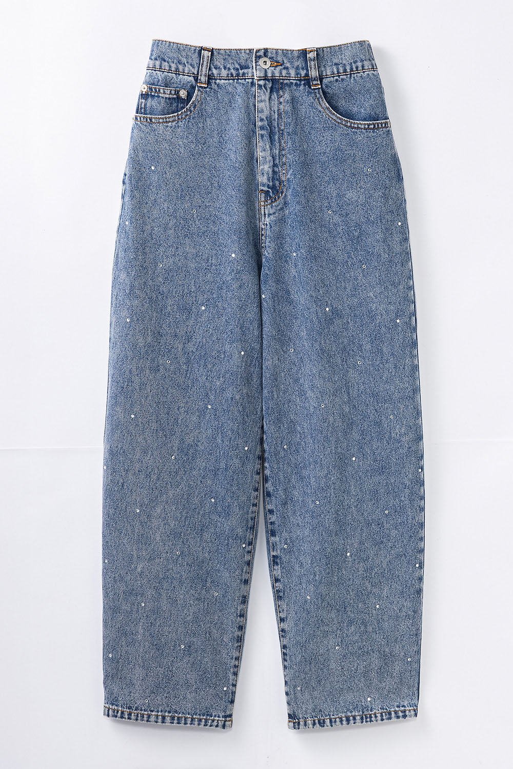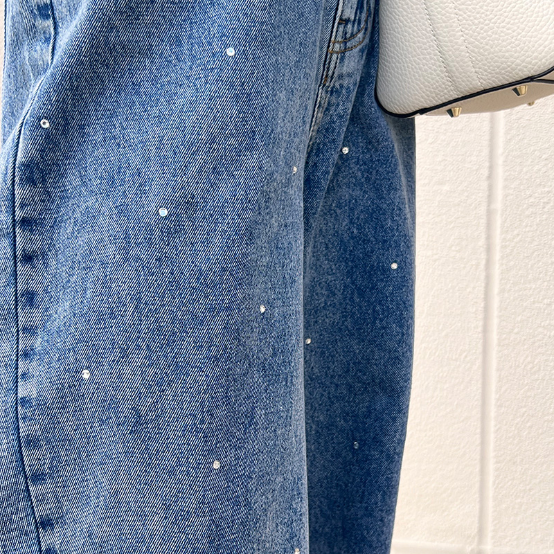ラインストーンを散りばめた華やかなデニムパンツ。