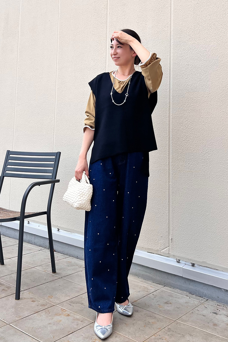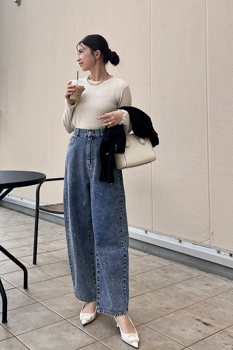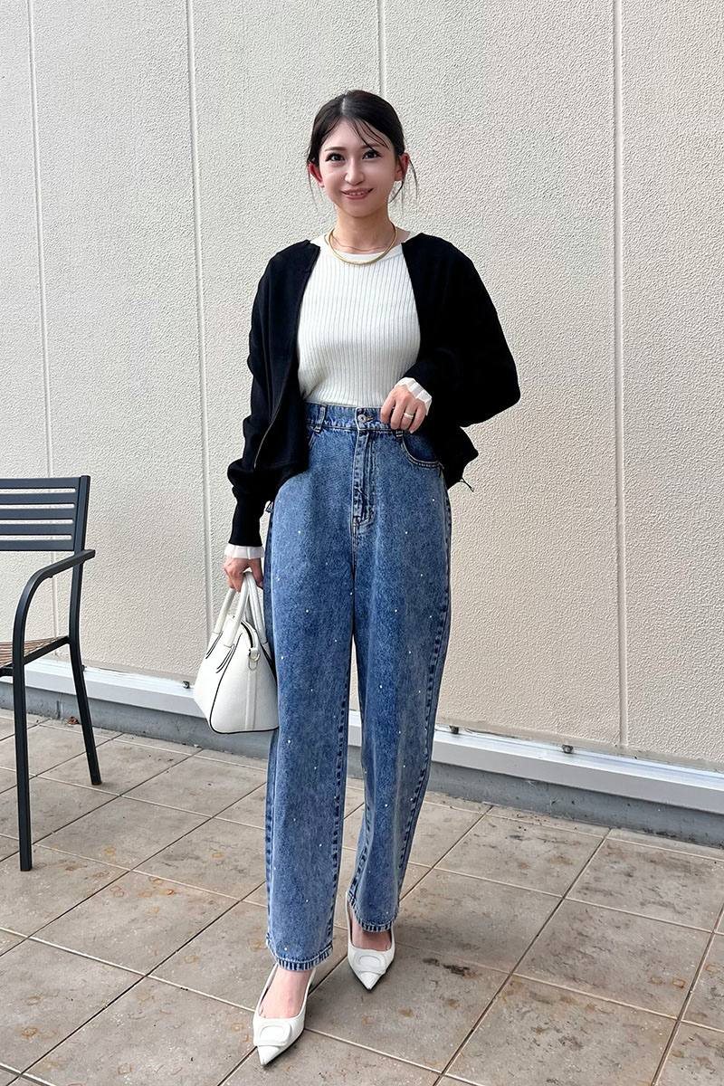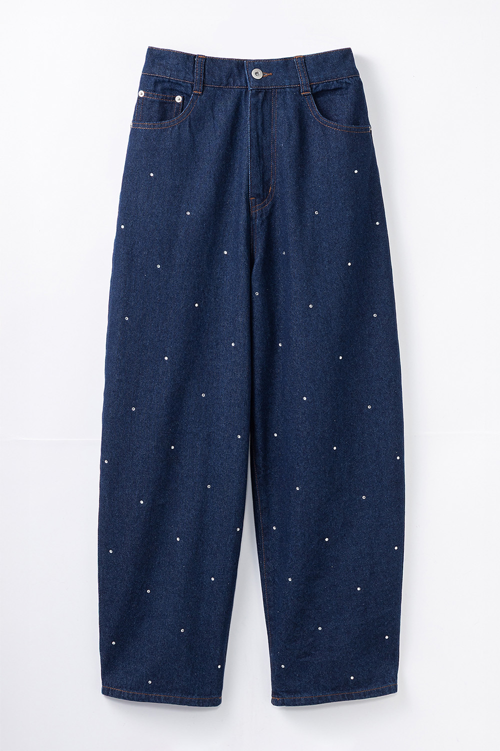 ラインストーンを散りばめた華やかなデニムパンツ。
