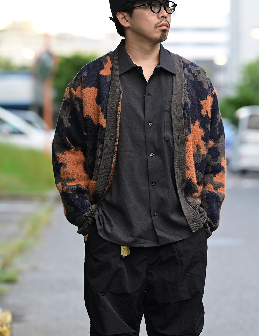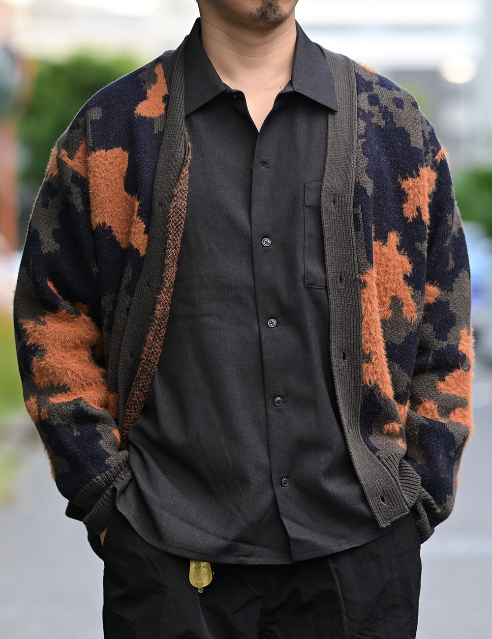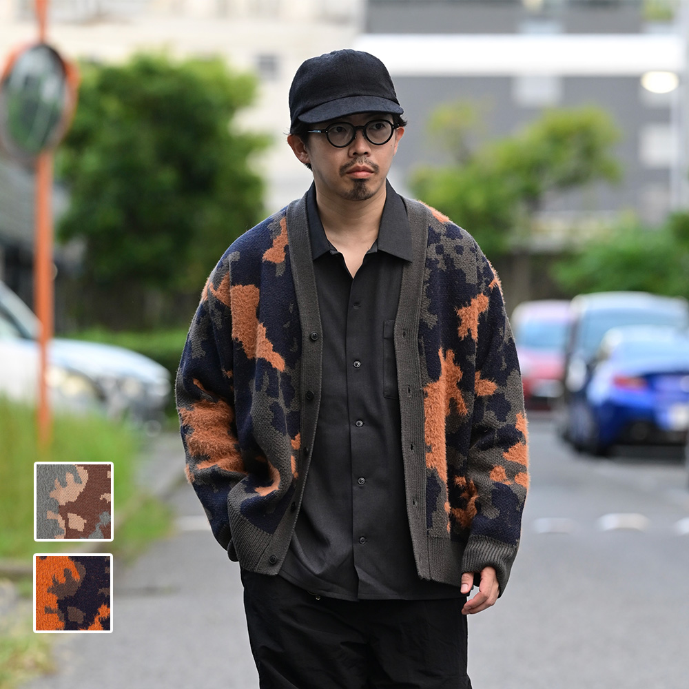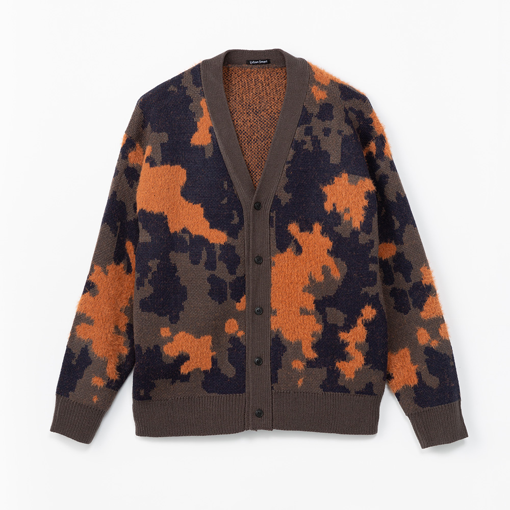 ペンキが飛んだようなスプラッシュ柄をWジャガード織りで表現したカーディガン。