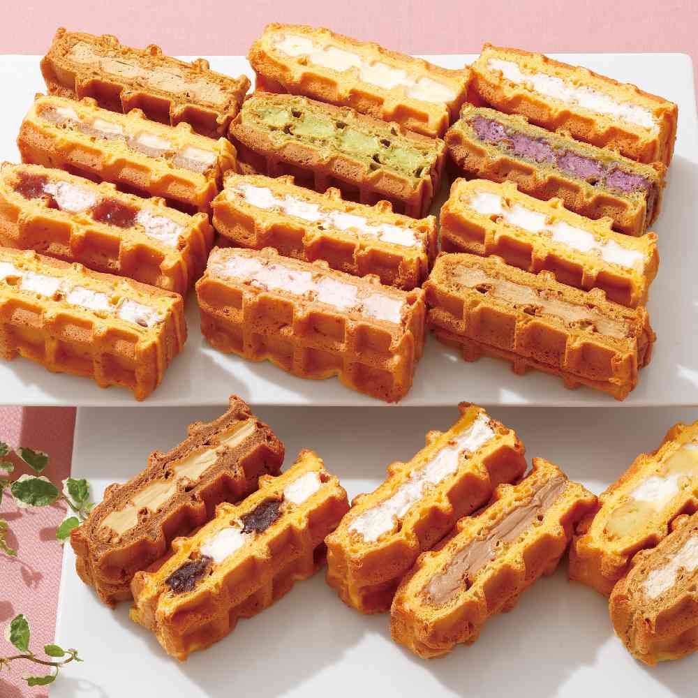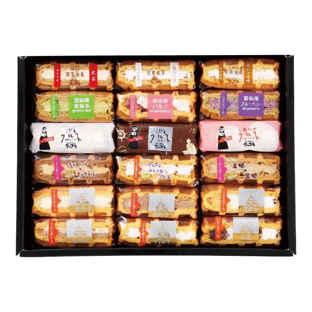 ボンパティのワッフル18(カスタード、チョコレート、マロン、チョコバナナ、バニラ、小倉、チョコレート×キャラメル、プレーン×レーズン、黒糖×黒糖、クルスワッフル、珈琲クルスワッフル、しあわせクルスワッフル、雲仙茶、雲仙いちご、雲仙ブルーベリー、生姜×紅茶、生姜×塩バニラ、生姜×合わせ味噌)