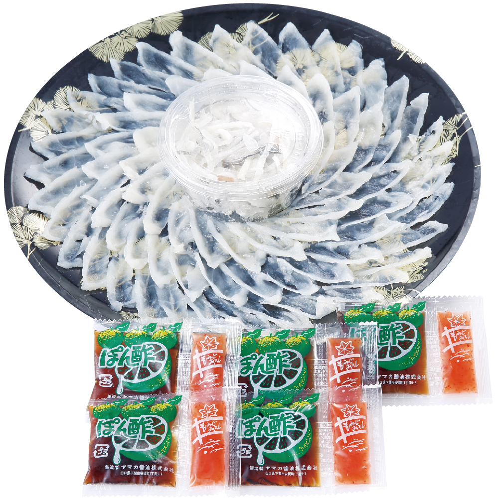 トップ 冬の贈りもの 鍋特集 吉田水産 とらふぐ刺身セット(4~5人前) トップ 冬の贈りもの 早得企画 吉田水産 とらふぐ刺身セット(4~5人前) トップ 冬の贈りもの 予算で選ぶ 7,000円~9,999円 吉田水産 とらふぐ刺身セット(4~5人前) 吉田水産 とらふぐ刺身セット(4~5人前) 商品番号wg20250088 カタログ番号6-19-52-5 創業100年を誇るふぐ問屋からお届けする国産とらふぐを使用した刺身を味わえるセットです。■承り期間:10/2~12/24 ■お届け期間:11/11~1/10 仕様 内容 とらふぐ刺身100g(長崎県産養殖)、とらふぐ皮湯引き80g(国内産養殖)、ぽん酢14g×5、紅葉卸し3g×5 賞味期間 (製造日より)冷凍にて30日間 原料産地 とらふぐ刺身(長崎県産養殖)、とらふぐ皮湯引き(国内産養殖) アレルゲン 小麦、大豆