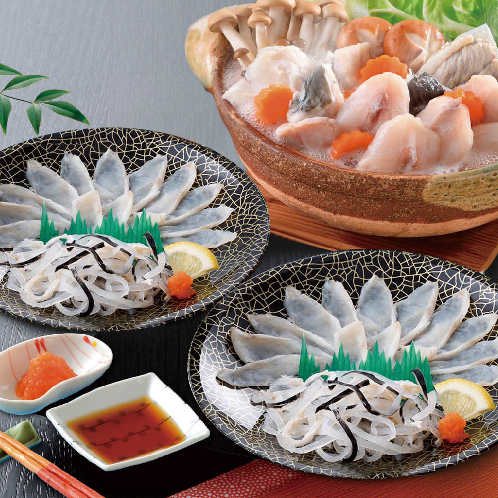身が締まり、歯ごたえが堪らない真ふく刺身と、淡白な中にも奥深い味が美味なふくちりをセットにしています。