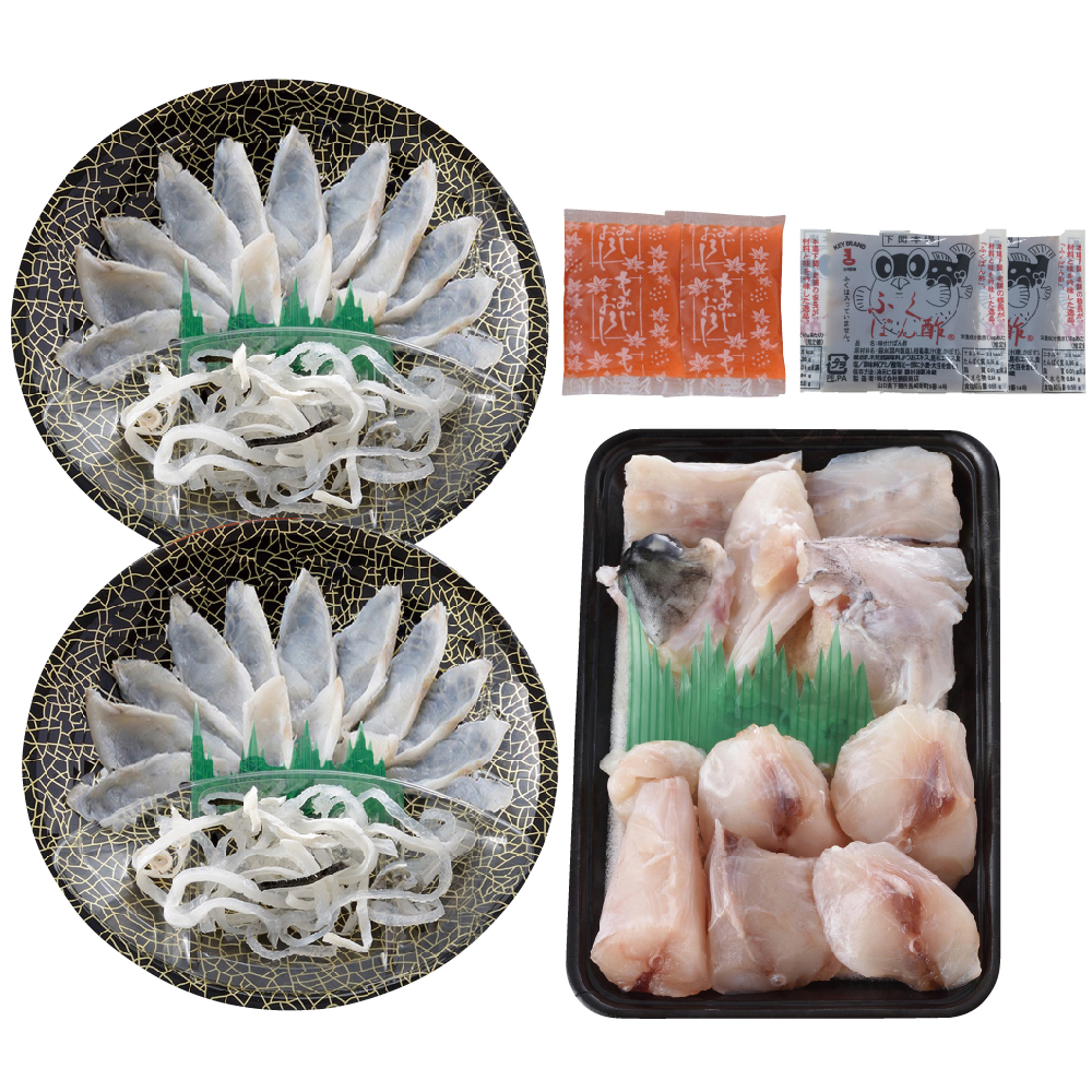 真ふく霜降り刺身20g×2、とらふく皮20g×2、ふくちり(シロサバフグ切身、トラフグアラ)200g、ふくポン酢10g×2、もみじおろし10g×2