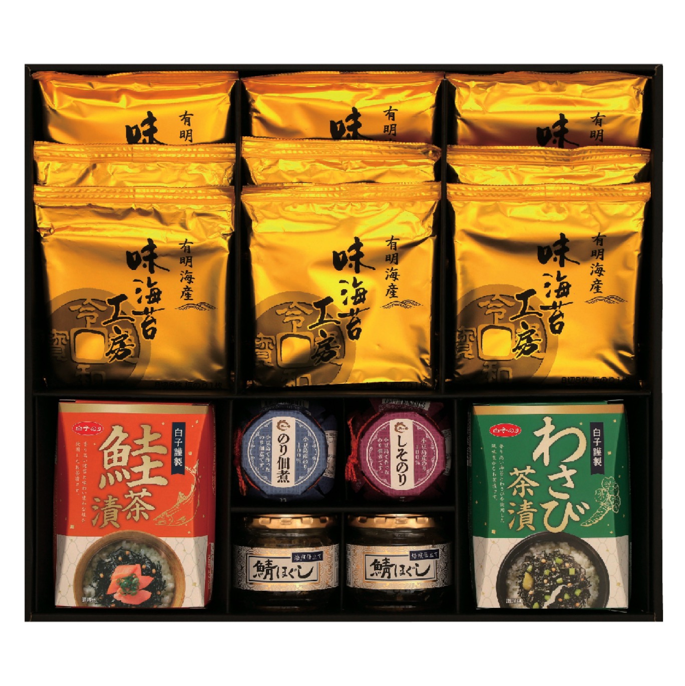 トップ 冬の贈りもの お茶・海苔・椎茸・漬物・佃煮・米 サン海苔&和の食卓詰合せ トップ 冬の贈りもの 予算で選ぶ ~4,999円 サン海苔&和の食卓詰合せ サン海苔&和の食卓詰合せ 商品番号wg20250590 カタログ番号6-69-55-7 有明海産特有の柔らかく旨みを含んだ海苔とご飯によく合う珍味とお茶漬けの和の食卓ギフトです。■承り期間:10/2~12/24 ■お届け期間:11/11~1/10 仕様 内容 サン海苔味付け海苔8切8枚×9、白子のり鮭茶漬(3.8g×3袋)、白子のりわさび茶漬(3.3g×3袋)、小豆島産のり佃煮80g、小豆島産しそのり佃煮80g、焙煎仕立て鯖ほぐし40g×2 型番 MMT-40JM 原料産地 日本 アレルゲン 小麦,乳,エビ,大豆,さけ,さば