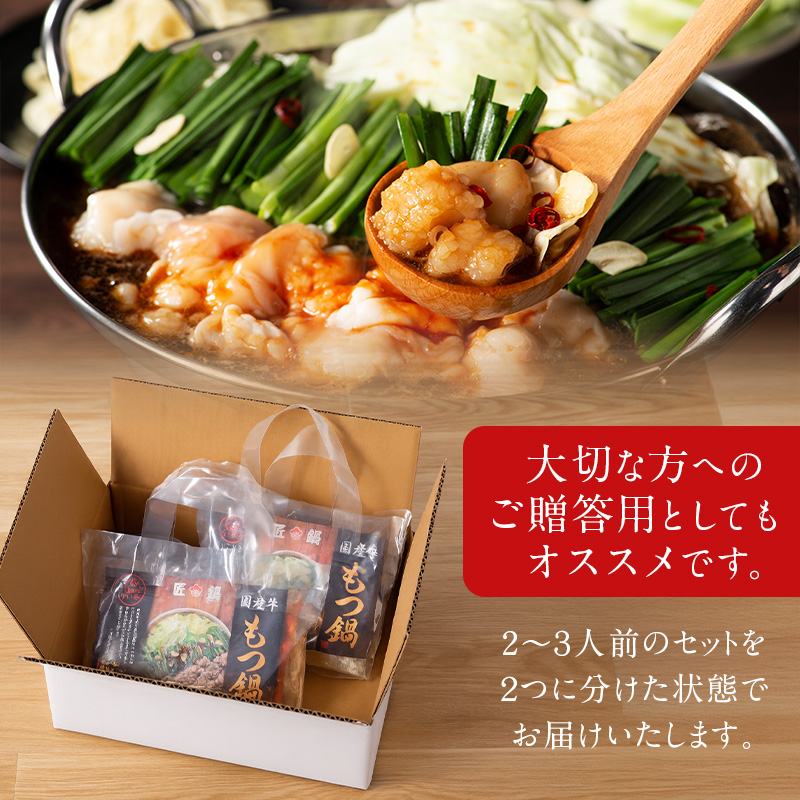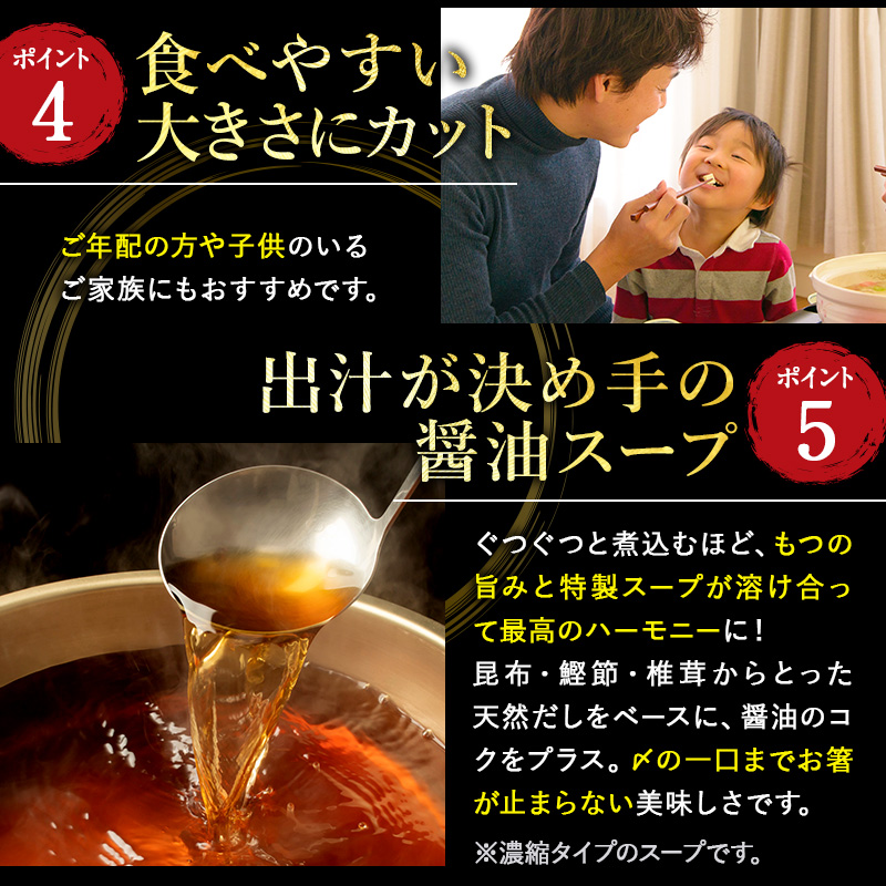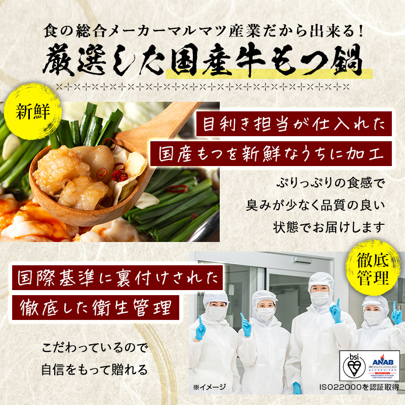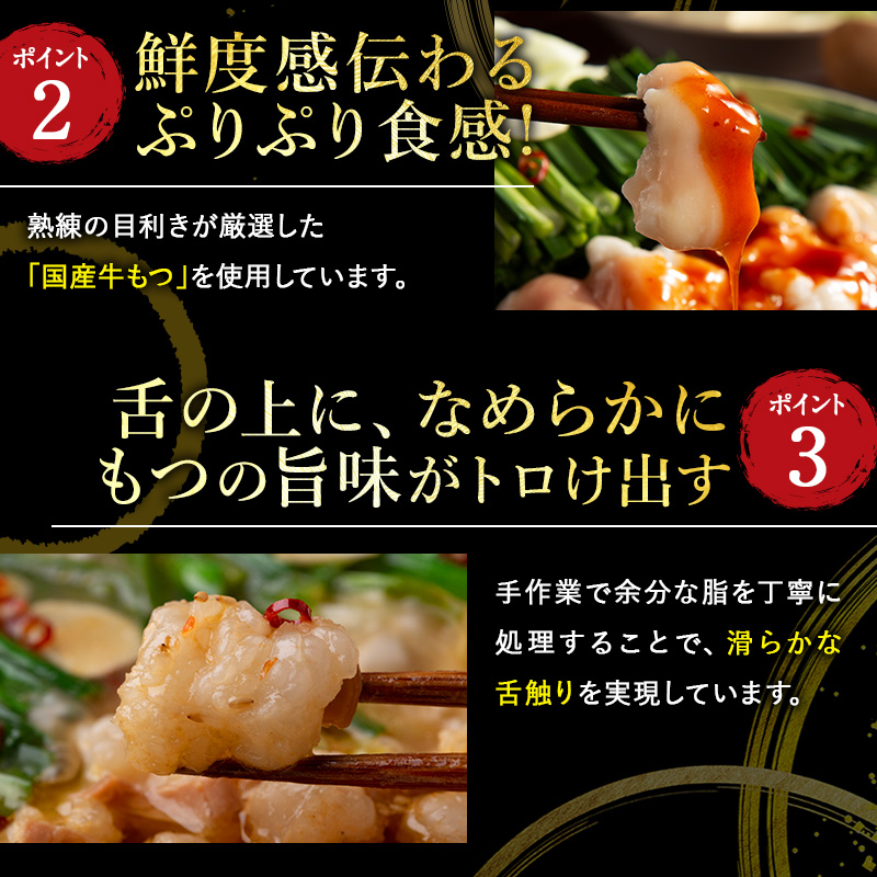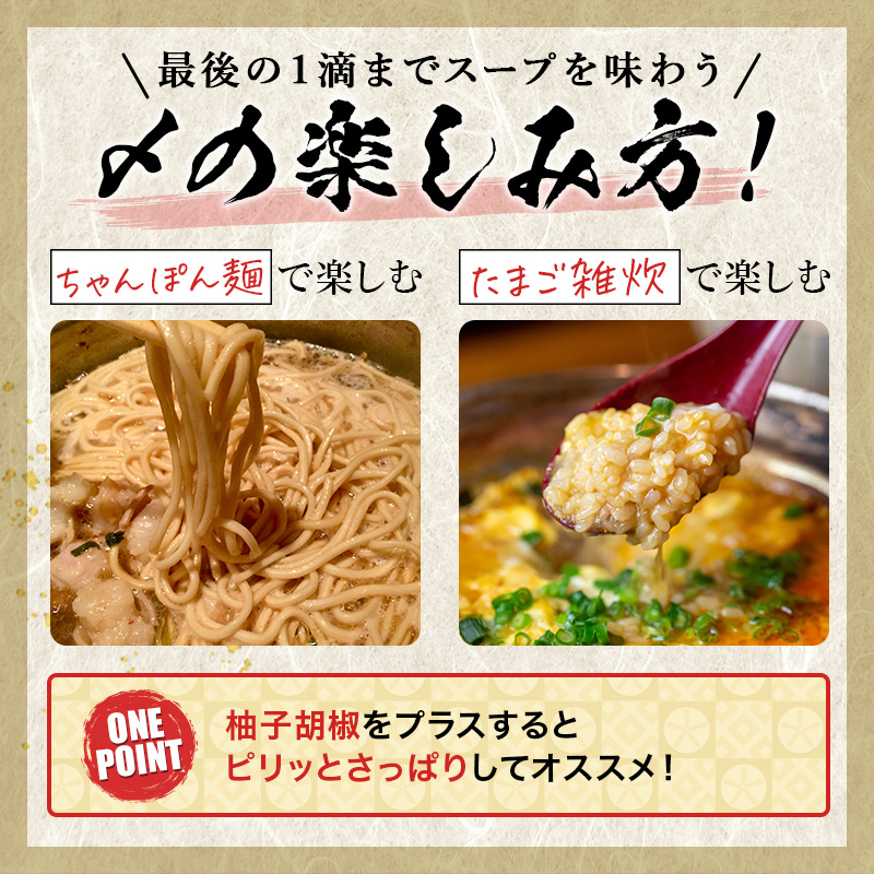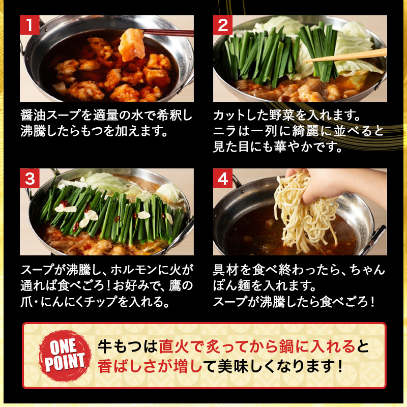 国産牛もつとスープ、ちゃんぽん麺、また、にんにくと鷹の爪もセットになっており、 野菜や豆腐などお好みの具材を入れて頂くだけで本場博多の味を再現できます。