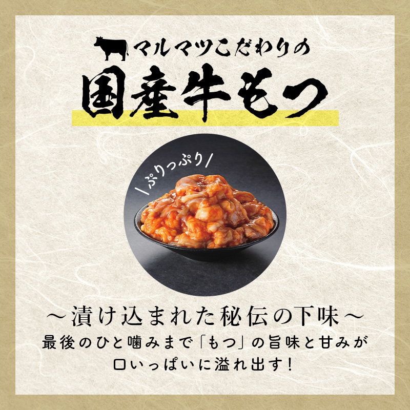国産牛もつには秘伝の下味が付けてあるので、全体のうまみが一段と引き立ちます。 2~3人前が2セット入っているので、2度に分けて召し上がっていただく事も可能です。