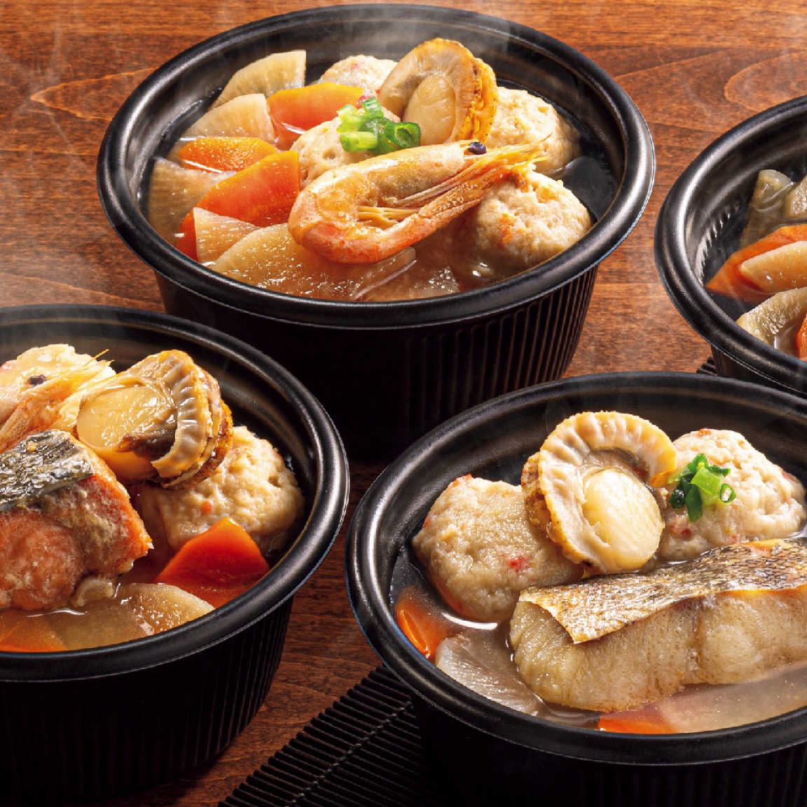 レンジで温めるだけですぐに食べられる4種類の海鮮鍋です。