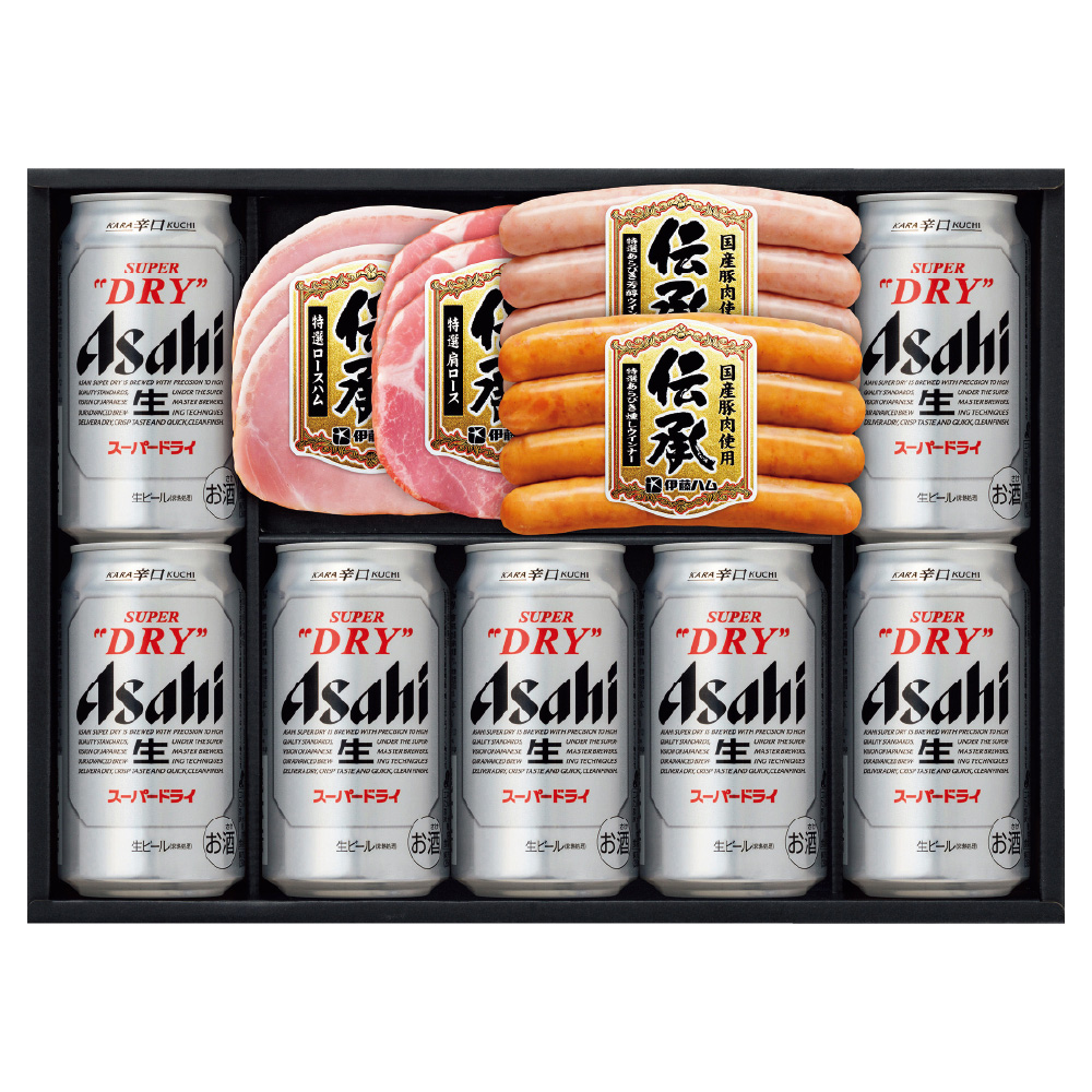 「アサヒスーパードライ」と国産豚肉使用のハム、ウインナーをオードブルとして詰合せたギフトセットです。