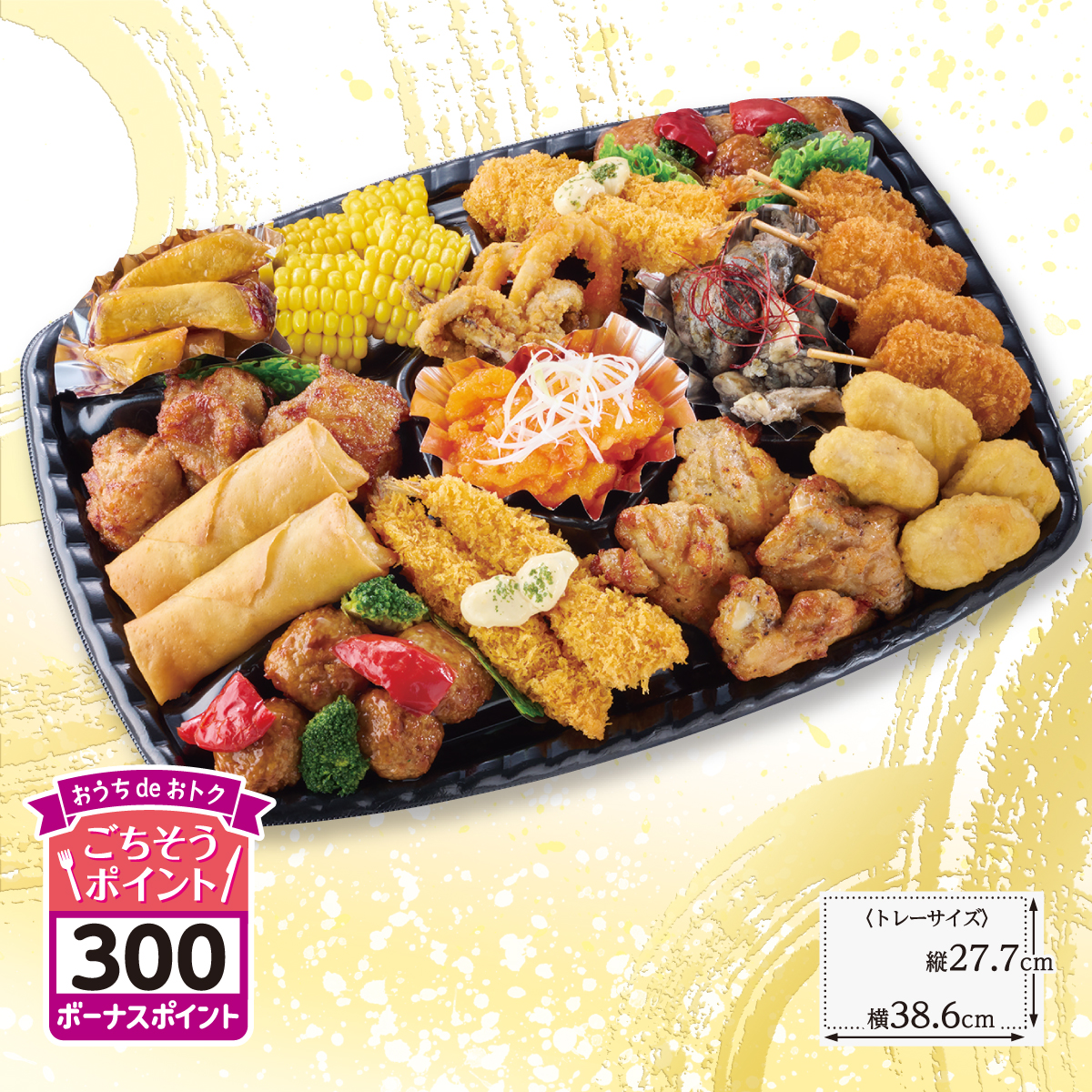 鶏ももから揚げや鶏の炭火焼き、イカから揚げ等が入ったオードブルです。