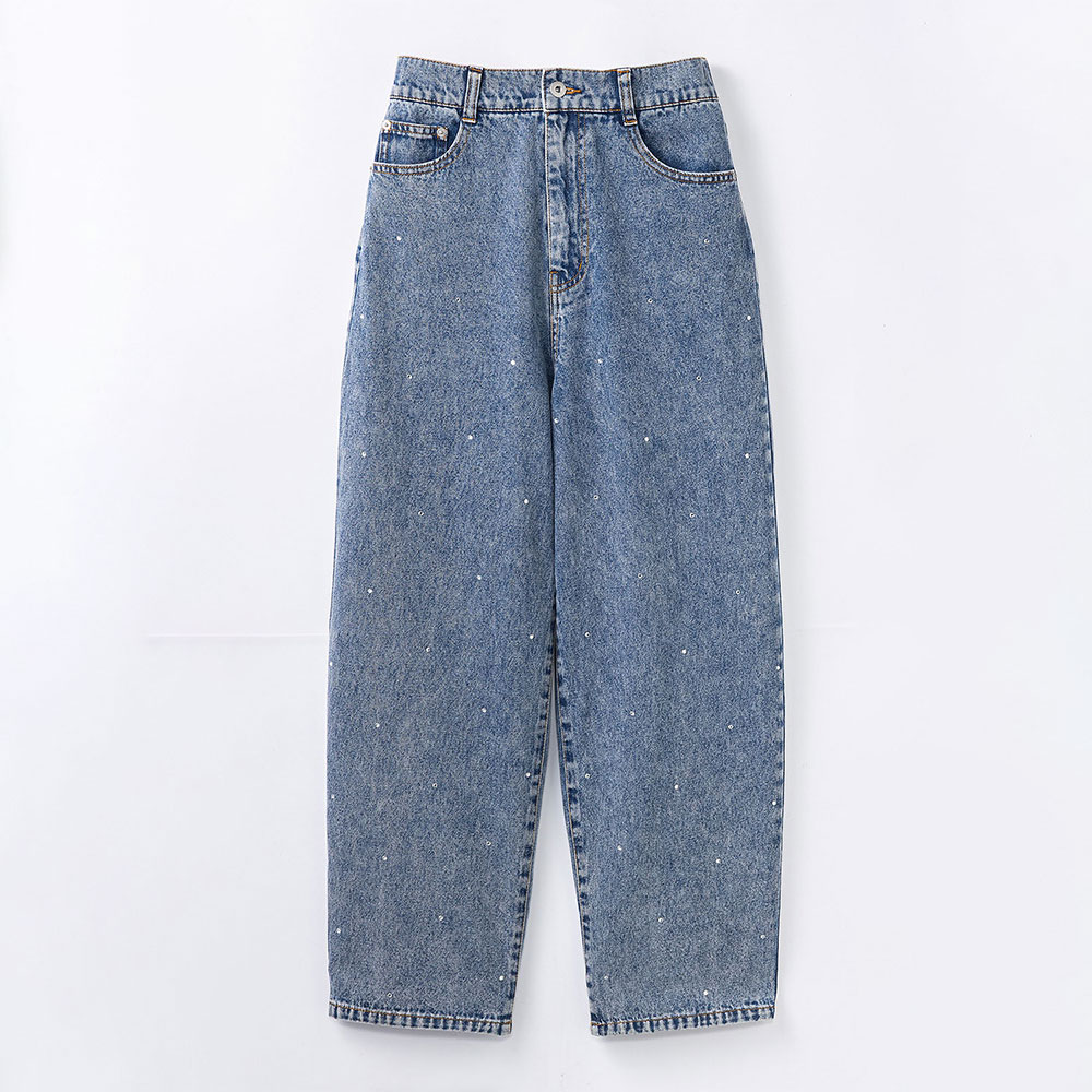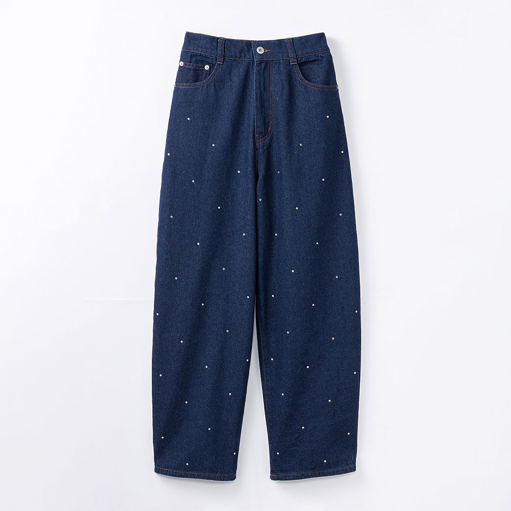 ラインストーンを散りばめた華やかなデニムパンツ。