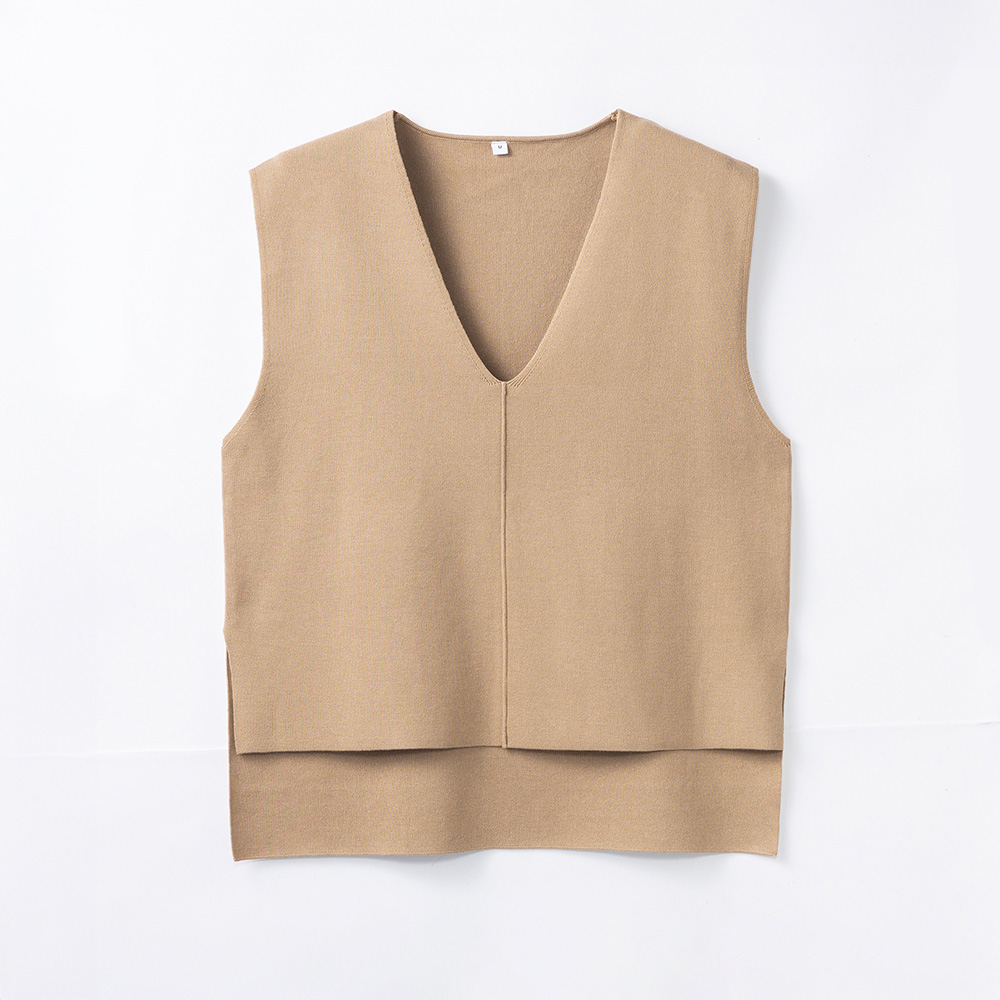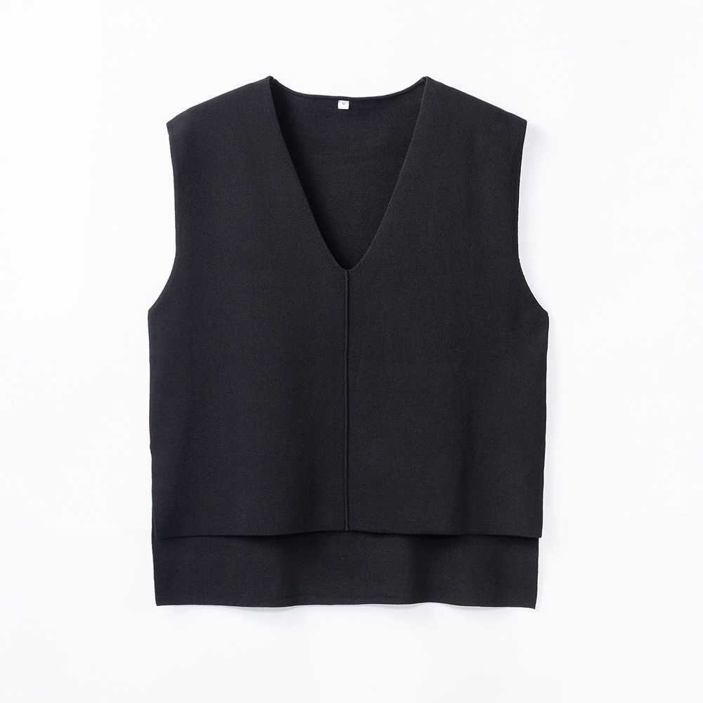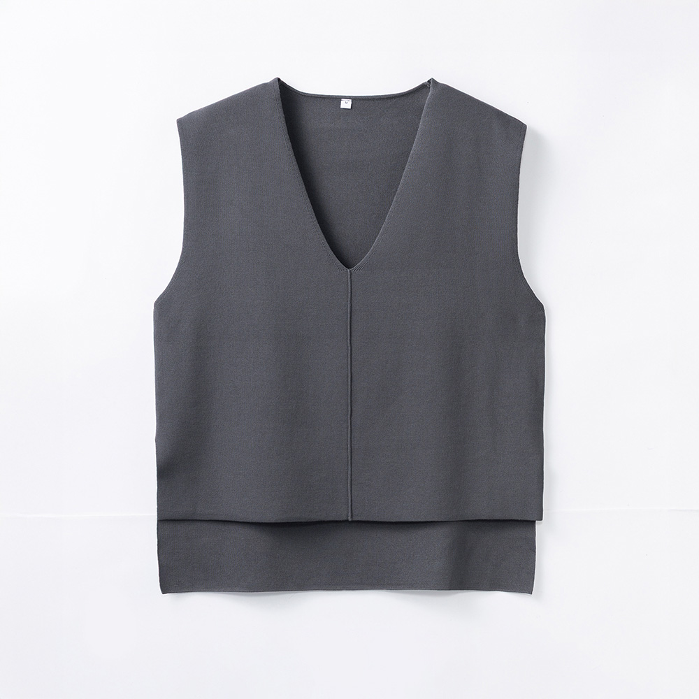 サイドスリットとセンターシームがポイントになり、Vネックが顔まわりをすっきり見せてくれるベストです。