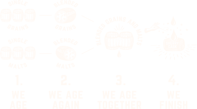 ダブルエイジ製法では、熟成されたモルト・グレーンウイスキーを ブレンド後再度熟成させるという2段階の熟成プロセスですが、 ダブルダブルは熟成されたモルト・グレーンをそれぞれ混ぜ合わせて熟成し、 そのモルトとグレーンをブレンド後、再度熟成。最後に熟成年数によって 異なるシェリー樽で後熟(フィニッシュ)させる4段階のプロセスになります。